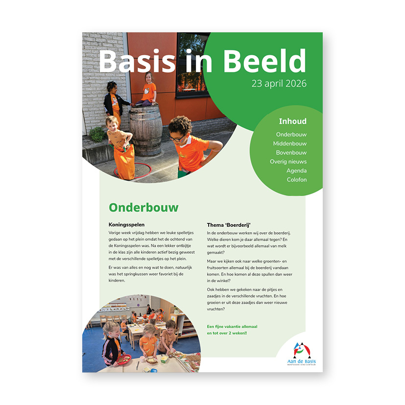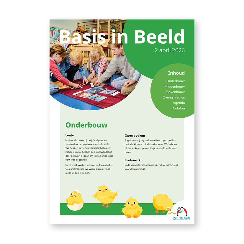 Iedere maand verschijnt onze schoolkrant Basis in Beeld. Leerlingen delen hun ervaringen, leerkrachten vertellen over projecten en activiteiten, en je leest meer over de sfeer en waarden die onze school zo bijzonder maken.
