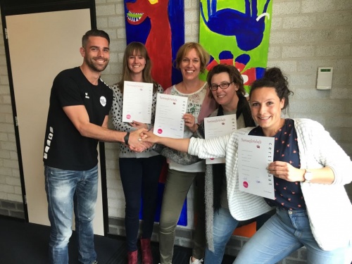 01 May 2017 - De onderbouw leerkrachten Esther, Tilly, Karin en Karlijn hebben uit handen van onze vakleerkracht bewegingsonderwijs Wilco den Hartog (Sportservice Veenendaal) het certificaat Beweegkriebels ontvangen.